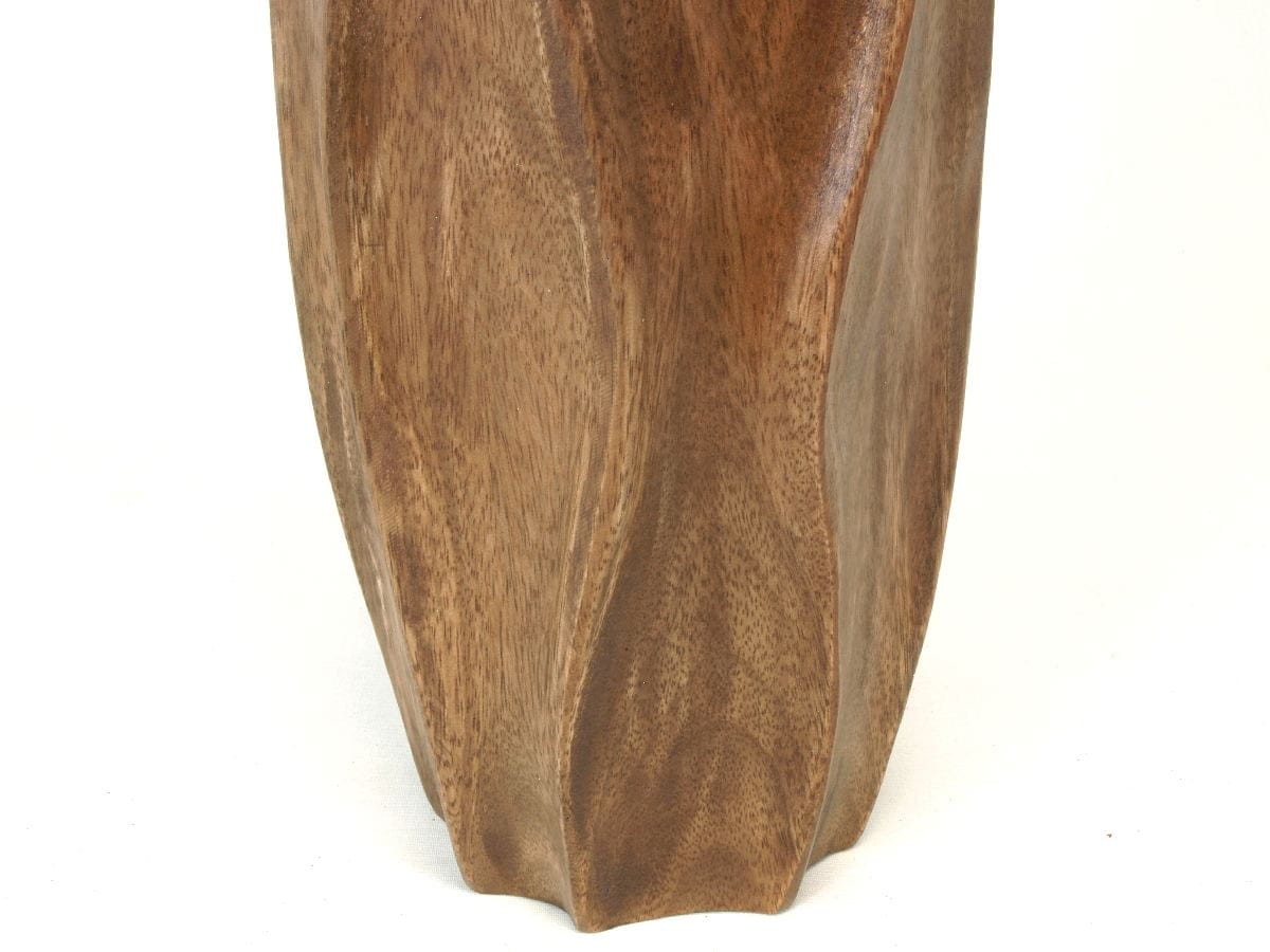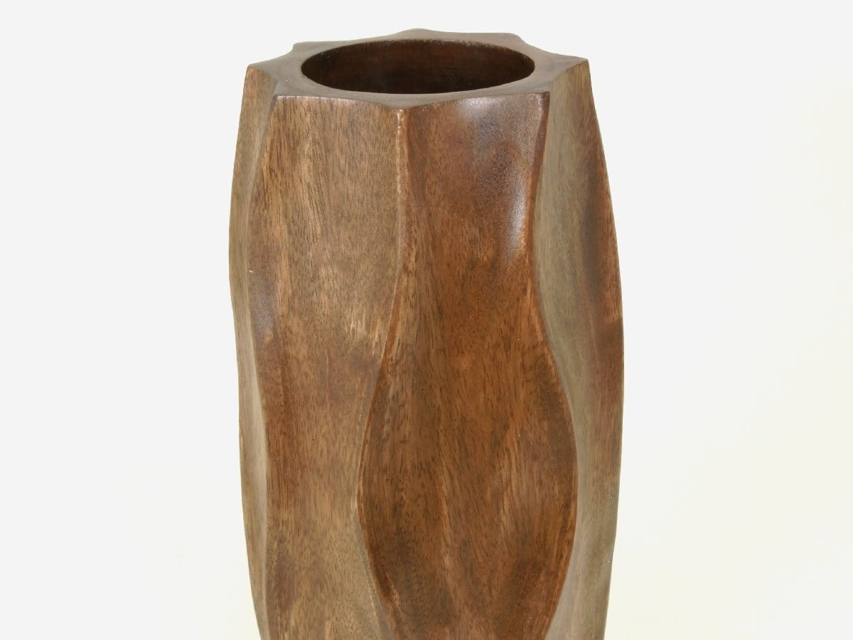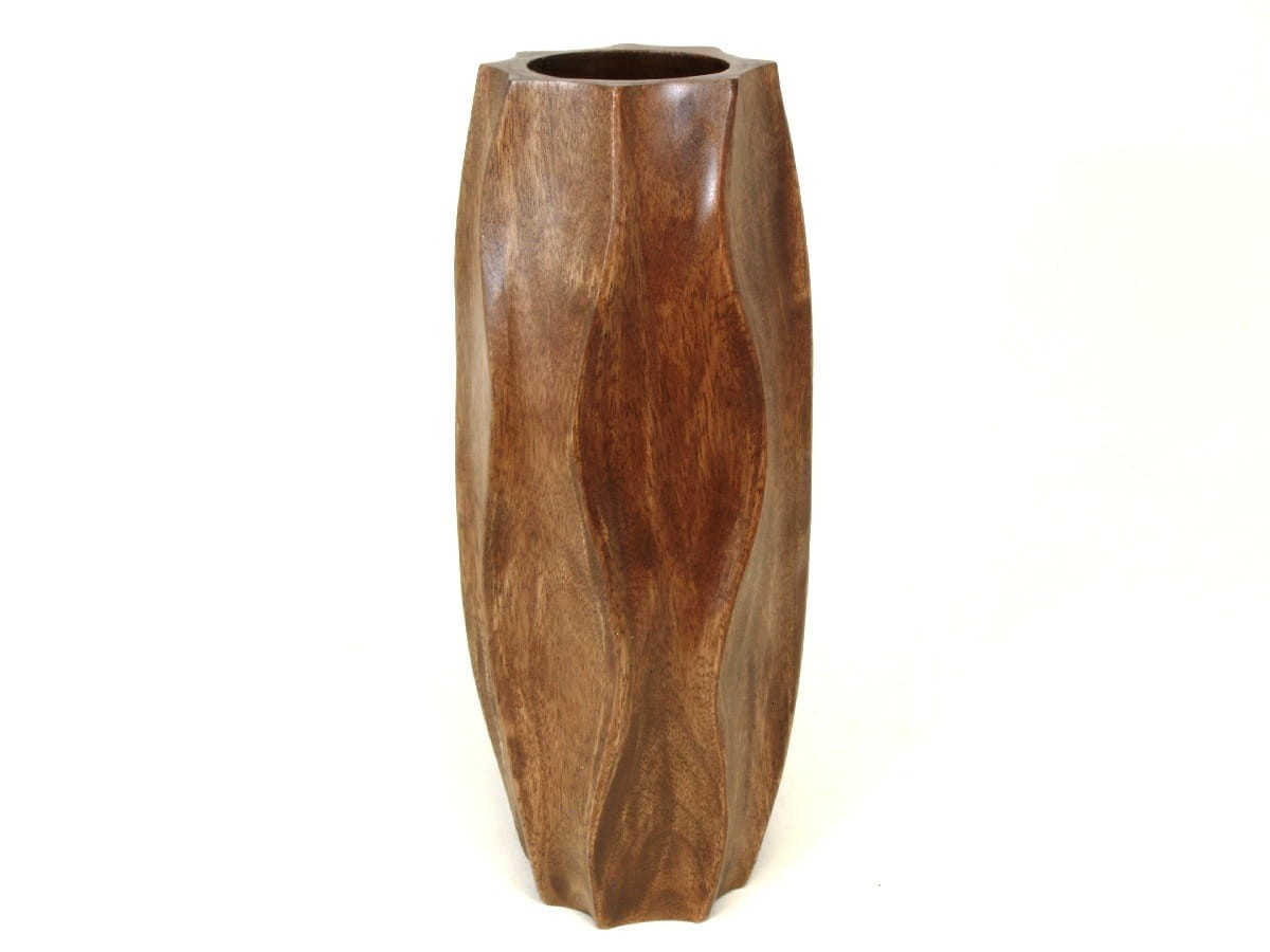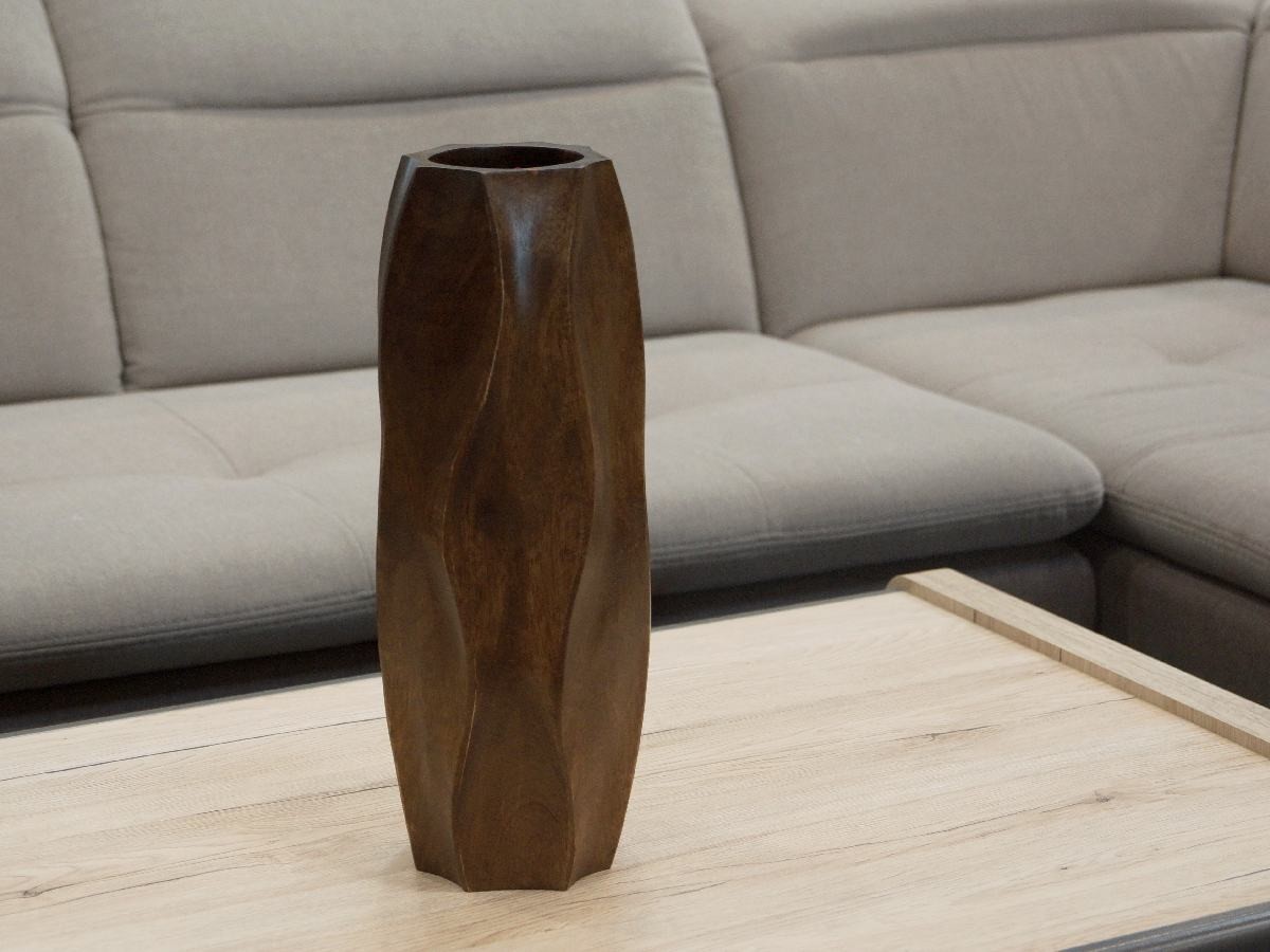 Oryginalny wazon drewniany w kolorze średniego brązu wykonany z jednego kawałka drewna mango o widocznym rysunku słojów i falistej powierzchni. Wazon można wykorzystać na suche kompozycje kwiatowe lub gałązki sztucznych kwiatów dostępne między innymi w tym sklepie. Wymiary wazonu: 15x38 cm. Średnica wewnętrzna otworu na kwiaty ma około 7,8 cm